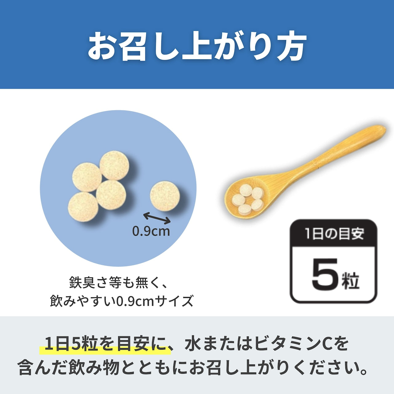 【お召し上がり方】栄養補助食品として一日5粒を目安に、ビタミンCの多い飲料と一緒にお召し上がりください。※就寝前及び起床時のタイミングがオススメです。