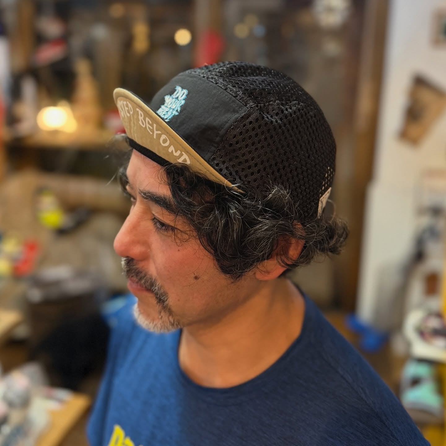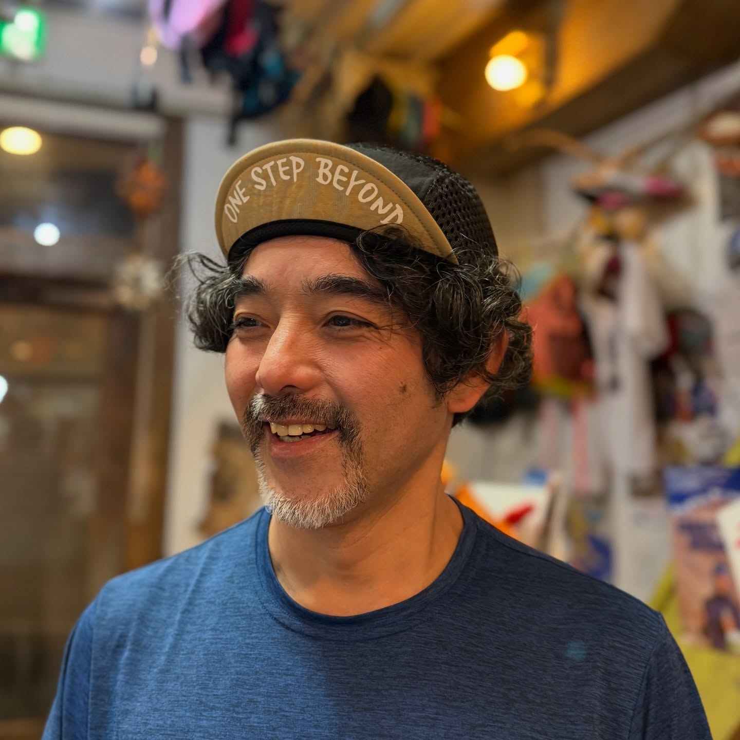 ブリム裏にも「One Step Beyond」のワードを手書き風のプリント配し、ツバを跳ね上げて被った際のアクセントになるように仕上げました。