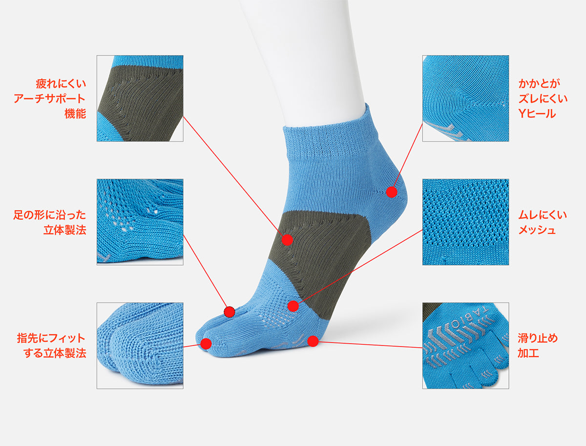 地面をとらえがいい!疲れにくく、走り心地の良い5本指のランニングソックスは、今ではランナーのメインストリームソックスと言ってもいいでしょう。立体製法でズレにくく、蒸れも感じさせない糸の配合から、モノ造りのノウハウを集結させたTabioの靴下。今までのも十分ご満足いただいたランナーは多かったのですが、さらに進化させました。