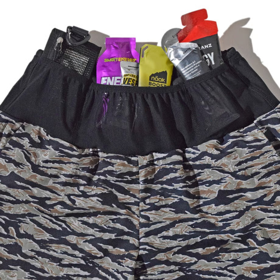 ウエスト部をフィット感の良いポリエステルジャージー素材に切り替え、その上にぐるりと360°に6つのメッシュポケットを搭載。