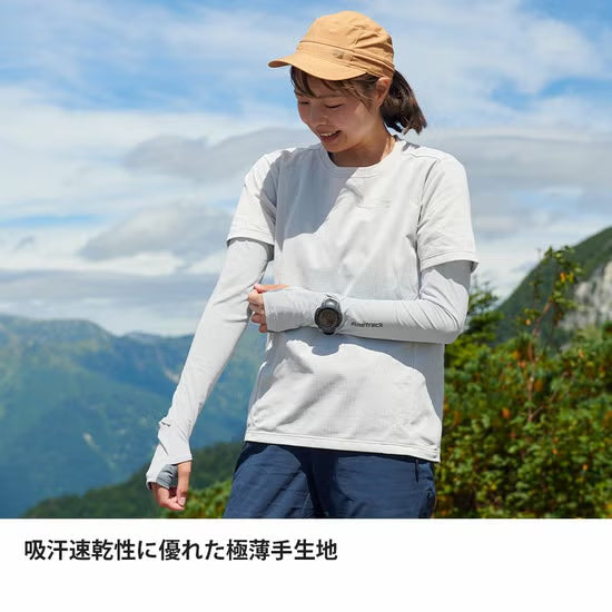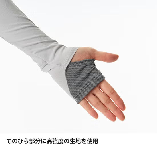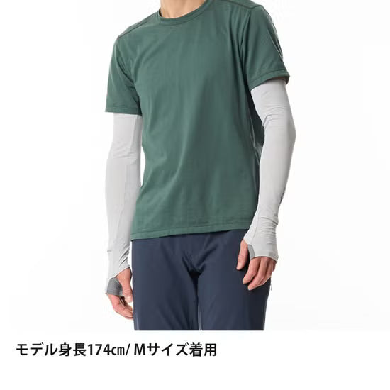 酸化チタンを高濃度に練り込んだ生地が日傘のような効果を発揮し、腕まわりの温度上昇を抑えます。汗を拡散・乾燥しやすい薄手設計で、炎天下でもドライ感を保ちます。手首側には腕時計用スリットを備え、着けたままでも腕時計やGPSウォッチの画面が確認しやすい仕様です。