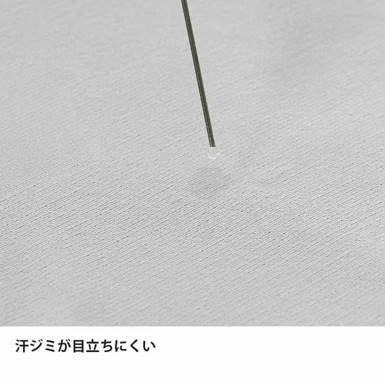 濡れたときに色が濃く見える“汗ジミ”に配慮した生地設計です。酸化チタンを練り込んだ繊維が、濡れた状態でも光を乱反射させ、汗ジミが目立ちにくい仕様にしています。