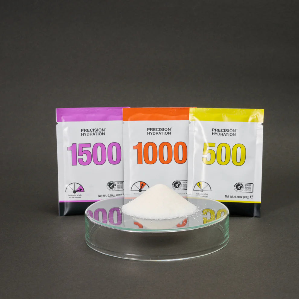 PRECISION(プレシジョン)の電解質パウダーには、人工的な成分は一切含まず、発汗量に合わせて強さを選べます。PH 1500は、最も強力な電解質ドリンクで、通常は適切に水分補給を始め、激しい運動後に早く回復することを目指すアスリート向けです。また、汗かきや塩分を多く排出する人々が運動中に使用することもあります。1袋20gを500mlの水に溶かして飲んでください。